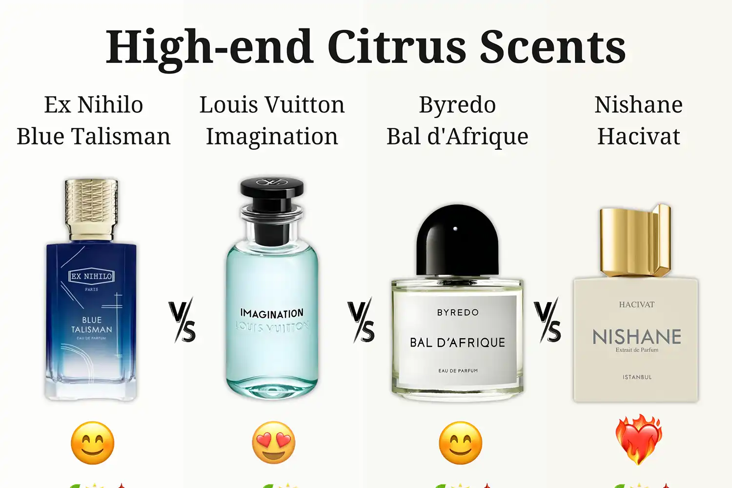 Nếu bạn tìm hương citrus cao cấp với hiệu suất mạnh và nhận nhiều khen ngợi, Nishane Hacivat là lựa chọn xuất sắc nhờ độ lưu hương lâu và vibe tươi sáng, nam tính. Louis Vuitton Imagination mang đến sự sang trọng, sạch sẽ, lý tưởng cho những dịp đặc biệt. Ex Nihilo Blue Talisman phù hợp với ai yêu sự tươi mát, dễ mặc nhưng cần hiệu suất tốt hơn. Byredo Bal d'Afrique độc đáo với hoa cỏ gợi cảm, nhưng hiệu suất yếu là điểm trừ. Tùy sở thích và mùa, hãy thử trực tiếp vì mùi phụ thuộc da.